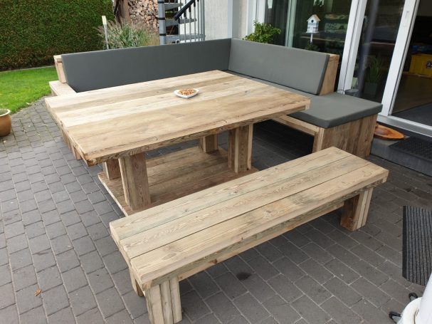 Wij van de dagbesteding zorg en activiteiten begeleiding noord Nederland maken voor u, uw loungeset op maat en naar uw wensen. Dit doen we samen met de cliënten op de dagbesteding. Hierien heeft iedereen een andere taak van het schoonmaken van het hout tot het maken van de loungesets. Het hout wat wij hiervoor gebruiken is damwanden hout. Het hout heeft vele jaren onder water gestaan. Doordat het vele jaren onder water heeft gestaan is het gehard. Waardoor het buitengewoon geschikt is voor buiten onder verschillende weersomstandigheden.